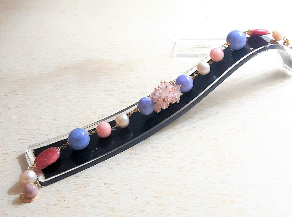 BRACCIALE IN ARGENTO VERMEIL, CALCITE BLU, RODOCROSITE, QUARZO ROSA E PERLE AKOIA ROUND