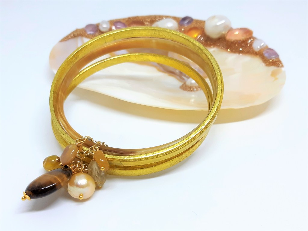 BANGLE IN CORNO NATURALE LAMINATO IN FOGLIA ORO, ARGENTO VERMEIL, PERLA GOLD AKOIA, OCCHIO DI TIGRE, OPALE GIALLO WELO E QUARZO CITRINO.