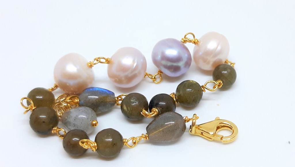 BRACCIALE IN ARGENTO 925, PERLE DI ACQUA DOLCE E LABRADORITE