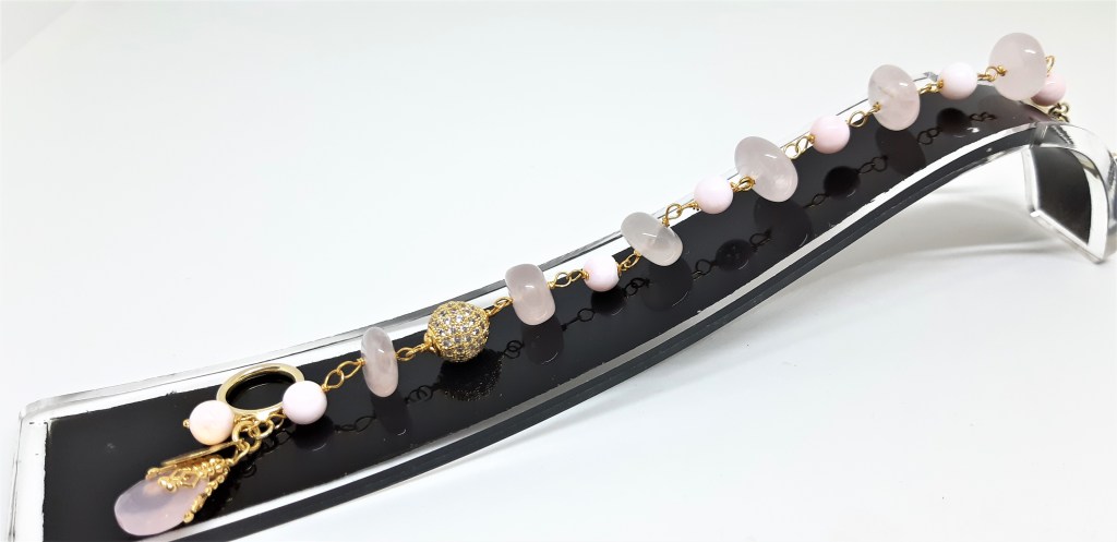 BRACCIALE IN ARGENTO 925 VERMEIL, QUARZO ROSA, CON ELEMENTI IN OTTONE LAMINATO ORO E PICCOLI CRISTALLI SWAROVSKY