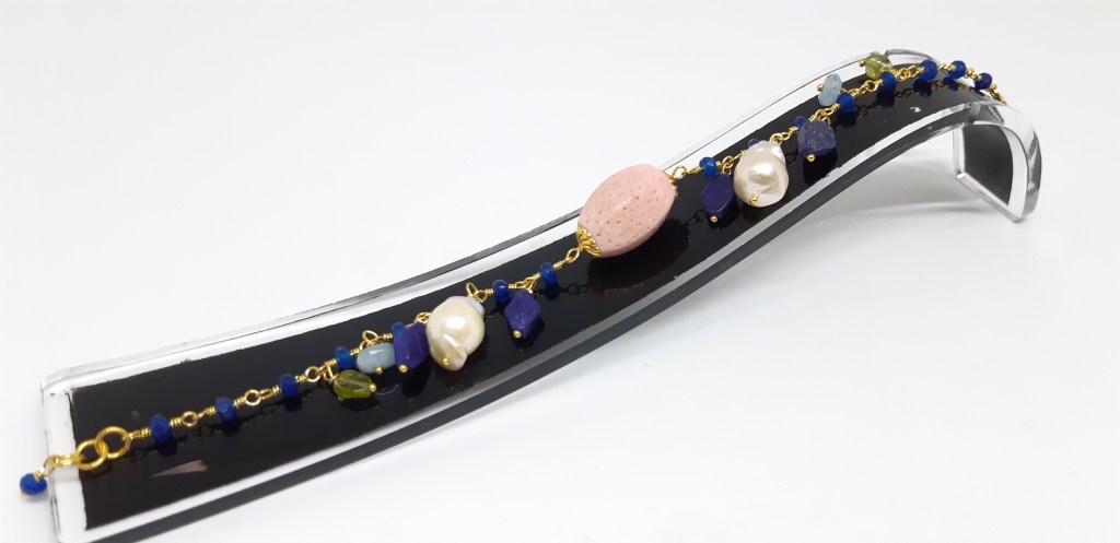 BRACCIALE IN ARGENTO 925 VERMEIL, GIADA, LAPIS, CORALLO MADREPORA, ACQUAMARINA E PERIDOTO