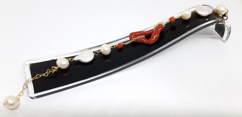 BRACCIALE IN ARGENTO 925 VERMEIL, CORALLO MORO MEDITERRANEO E PERLE